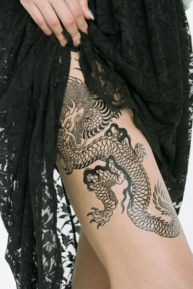 ビッグサイズでインパクト抜群!パーティーやイベントに大活躍のタトゥーシール「大型・線画黒龍」。コスチューム等に合わせて露出した肌に貼り付けるだけ!特殊な素材を使用しているので皮膚の動きと一緒に伸び縮みし、入浴したり海やプールに入っても2〜3日は取れません。祭り化粧を取る際は、専用のクリーナーやクレンジングクリーム、ベビーローション等で拭き取って下さい。