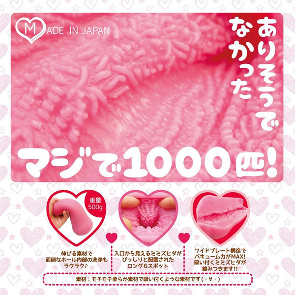 ガチで1000匹!ありそうでなかった本当の『ミミズ千匹』を体験できるオナホール「ハメ撮りナースのミミズ千匹」。吸い付くように柔らかな素材と肉厚感で締め付ける重量500gのモチモチとしたボディ。入口から見えるミミズヒダがびっしりと配置されたロングGスポットと吸い付くミミズヒダが絡みつくワイドプレート構造でバキューム力もMAX。比喩ではなく本物の『ミミズ千匹』分の快感を実現!びっしりとひしめき合う1000本の肉壁ヒダがグニュグニュと絡んで極上の挿入感を生み出すオナホール。伸びる素材を使用したボディはホール内部の洗浄もラクラクです。
