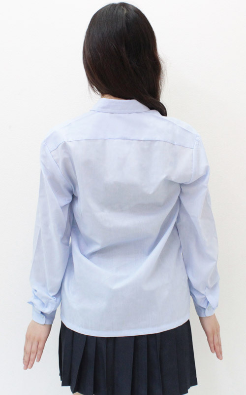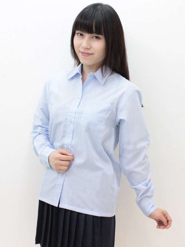 白シャツとは異なる魅力!パリッと着こなしたいサックスカラーの長袖シャツ単品。手持ちの制服コスチュームを、これ1つでマイナーチェンジ!このポケットつきのトップスは、ストレート裾なのでスカートの上に出して着用しても似合います。※水洗い不可、塩素系漂白剤による漂白不可、アイロンは中温で当て布使用、ドライクリーニング可。※こちらの商品は在庫の状況によりお届けまでに4日〜7日程度かかる場合がございます。