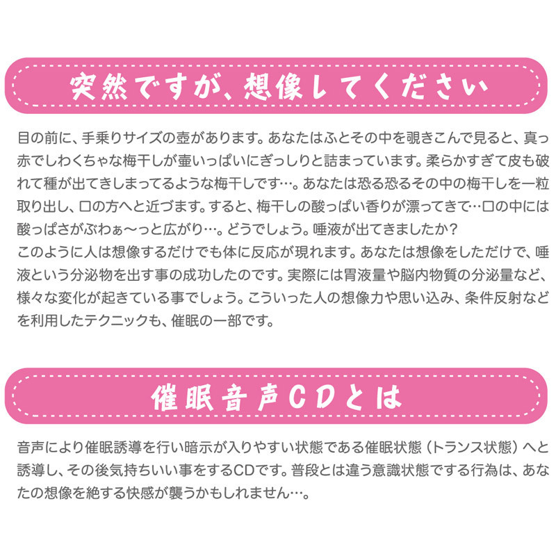 音声CDを聞いてホールで抜く!聴覚を利用して催眠導入を補助するCDと、こだわりを詰め込んだスキンカラーの超初心者用の催眠音声 オナホ。催眠導入後、想像による暗示をかけてトランス状態に誘導します。ホールは単独でも使用可能!奥に行くほどタイトになるキツめのヒダ系です。巷でウワサの催眠オナニーでいつもの数倍気持ちよくなろう。