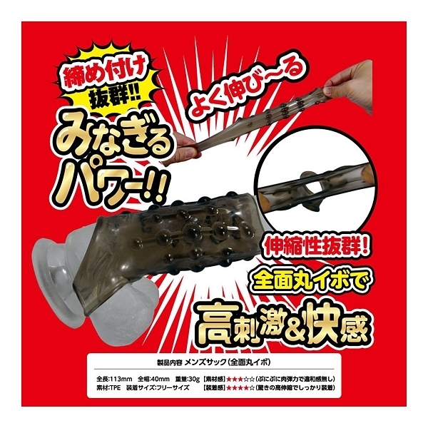 夜もがんばリング、で大人気のやわらかメンズリング「ち●こリング」シリーズに、スーパーなサックが新登場!今度のち●こサックは「ベースに装着するメンズサック」!ぷにぷにっとした柔らかなTPE(エラストマー)素材は、ぐい〜んとよく伸びる高伸縮性!サイズ問わずでどんな大きさでもしっかりフィットの抜群の装着感&締付感!さらに、ツンツンとしたトゲトゲ突起による高刺激快感が!男らしさを引き立たせるスモークカラー!「No.1」は、刺激高めにぐるっと配置された全面丸イボ突起!規則的に並んだ大小丸イボがアナタをスーパーに変身させるはず!ほとばしるストロング、みなぎるパワー!