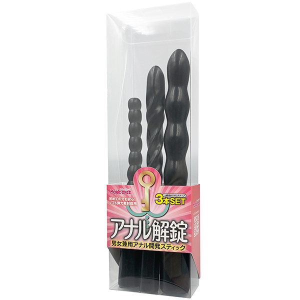 初めてのアナルから3ステップ開発用3本セット!!男女兼用ソフトな弾力素材を採用した日本製。STEP1全長150mm先端部の径10mmのつぶつぶスティック。STEP2全長170mm先端部の径13mmの拡張しつつ刺激も楽しめるらせん状スティック。STEP3全長180mm先端部の径16mmのパール風ロングスティック。●カラー:スモーク
