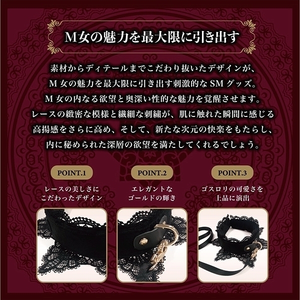 首輪、リードの2点セット。非日常を体験するのにチープ物では気持ちも盛り上がりません。高級感あるベロア生地とレースで飾りつけた心の奥のM願望を刺激してください。