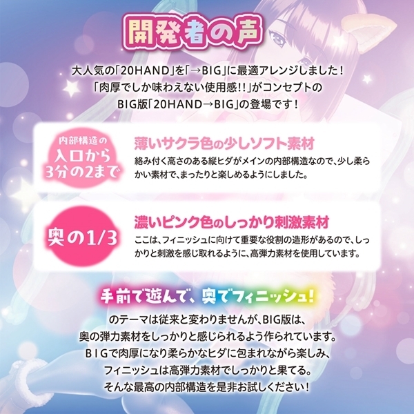 大人気の「20HAND」をボリュームアップした非貫通タイプの肉厚オナホールです♪高弾力素材を採用し、しっかりと包み込む圧迫感と柔らかな挿入感が楽しめます!内部構造は、入口から3分の2までがソフト素材の縦ヒダでまったり楽しめ、奥の1/3部分はしっかりとした刺激を感じる高弾力素材!「手前で遊んで、奥でフィニッシュ!」のテーマはそのままに、BIGなサイズでリッチな体験が可能です♪
