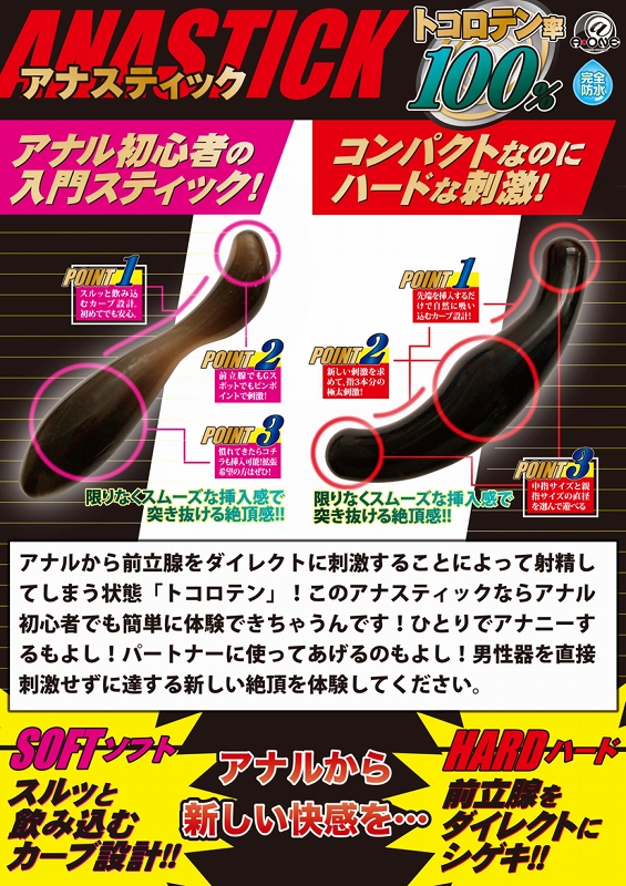 超話題!前立腺刺激で射精する「トコロテン」が楽しめるアナルスティック。美しいカーブと中間のくびれが特徴的な流線形状で、スルッと挿入できちゃうから初心者にもオススメ。コンパクトなスティック型ボディで前立腺をピンポイントに刺激します。「トコロテン率100%」を誇る、前立腺マニアも納得のソフトなアナルスティックです。