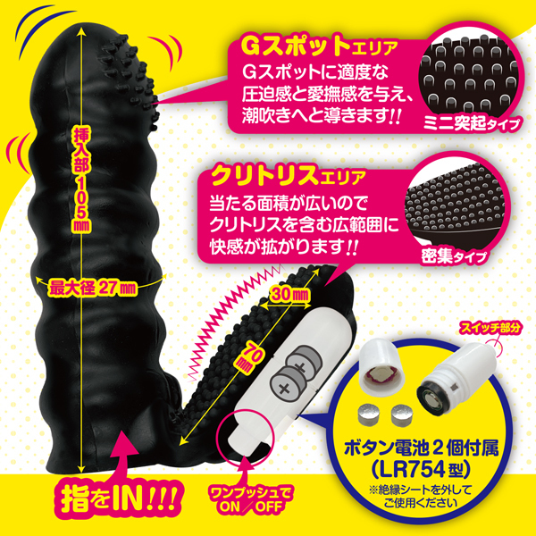Gスポット&クリトリス同時ダブル責めの悶絶サック。指に装着するだけで摩擦&振動のあなたの手マンプレイがスマートに♪カラーは定番2色展開「ブラック」と「ベージュ」。ブラックは暗闇でも目立たず、かっこよく責める事が出来ます。【クリトリスエリア】当たる面積が広く設計されており、脱着式のローターをINして使用するとサワサワと心地よい振動で快感に。アナタのテクニックでさらに悶絶させちゃおう!【挿入部分】緩やかなカーブで内部を傷つけずそれでいて、適度な圧迫感を可能に。【Gスポットエリア】ピンポイントにミニ突起が配置されているのでいつもより刺激が増幅。片手が空くので、パートナー女性の望むまま、いつもより責めプレイを楽しむ事が出来ます。ローターを外せば丸洗いでき、繰り返し使用可能。伸縮性のあるエラストマー素材でお肌に優しく、どんな指にもフィット。サックをはめていれば傷つける心配もないので、ズボズボ責めて潮吹きプレイをお試しあれ。