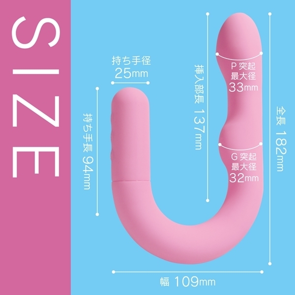 セルフケアに特化したU字型バイブレーターです♪ヘッド・Gポイント・外側への刺激、それぞれに専用モーターを搭載!3箇所を個別に操作できるので、好みに合わせた細かなカスタマイズが可能です♪振動は5段階の強弱調整と5種類のリズミカルなパターンを組み合わせた、計10種類を搭載!押し当てて楽しむ独自の形状が、今までにない使用感を提供します♪高性能モーターと高品質素材を組み合わせた、安心のジャパンクオリティ設計!オールシリコンボディは、しっとりとしたやさしい触り心地で、ストレスフリーな使い心地を実現しています♪約120分の充電で、最大約60分の連続使用が可能!(使用環境により変動します!)IPX6の防水仕様で、使用後も簡単に洗えて衛生的です♪
