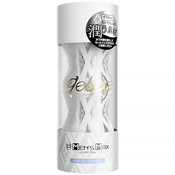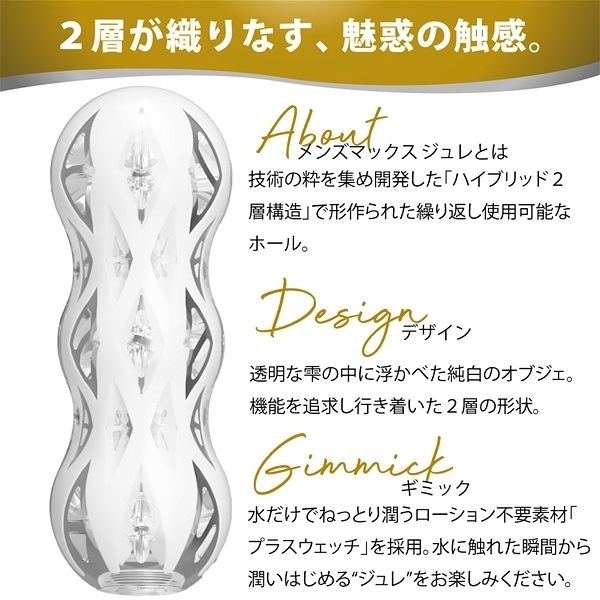 【ジュレカラットの内部構造】カラットポリッシャー(クリスタルゲル層)研磨機の様なギザギザ構造がシンプルながらやみつき。カラットピラミッド(プラスウェッチ層)光り輝く大粒のダイヤの様なギミックが攻め立てる。【メンズマックスジュレとは】技術の粋を集め開発した「ハイブリット2層構造」で作られた繰り返し使用可能なホール。【デザイン】透明な雫の中に浮かべた純白のオブジェ。機能を追求し行き着いた2層の形状。【ギミック】水だけでねっとり潤うローション不要素材「プラスウェッチ」を採用。水に触れた瞬間から潤いはじめるジュレをお楽しみください。【新開発のハイブリッド2層構造】内側と外側が分かれた単純な2層構造ではなく2層のどちらも軟性樹脂が露出する。それぞれの性能がとろけるように絡みあい楽しめるハイブリッド2層構造を新開発。【プラスウェッチ層】水だけでねっとり潤うローション不要素材。温水を使用すればホットプレイも簡単。【クリスタルゲル層】外側を覆いながら内側まで露出するどこまでも透き通るクリスタルゲル層。【乾燥スタンド】ジュレの容器は水切りしやすい構造になっており、そのまま乾燥スタンドとしてお使い頂けます。洗い終わったジュレをタオルなどでよく拭き、乾燥スタンドに設置してください。【繰り返し使用可能】使用後は水・またはぬるま湯で洗い流してください。洗い終わったあとは付属の乾燥スタンドに設置し、直射日光や高温を避け、風通しの良い場所に保管してください。