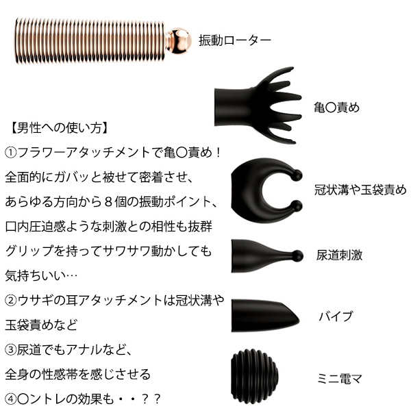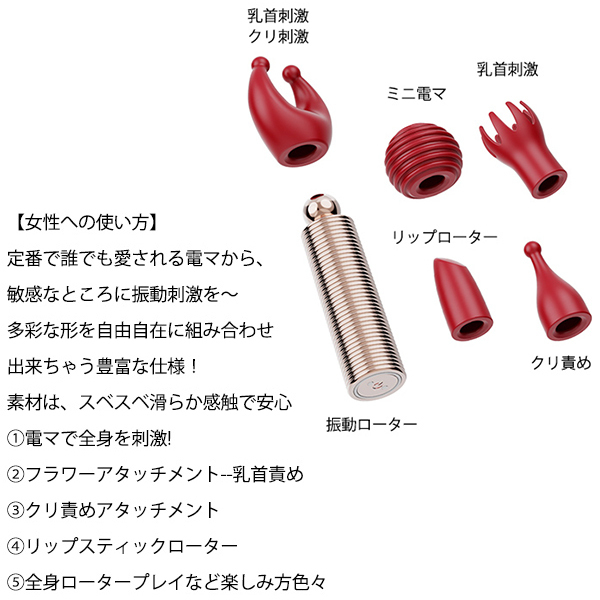 【男女兼用バイブセット】小さいのにパワフル!10種類振動×5つの付属アタッチメントを全身くまなく責めまくる!想像を超える組み合わせは一人でもパートナーと一緒でも使えてコスパ最高。初心者から上級者、ノーマルからSMまで幅広いニーズに対応アイテム。一つだけじゃ足りないかも?二色揃って使うのもオススメ。【女性への使い方】定番で誰でも愛される電マから敏感なところに振動刺激を〜多彩な形を自由自在に組み合わせ出来ちゃう豊富な仕様!素材はスベスベ滑らか感触で安心。@電マで全身を刺激!Aフラワーアタッチメント−乳首責めBクリ責めアタッチメントCリップスティックローターD全身ロータープレイなど楽しみ方色々。【男性への使い方】@フラワーアタッチメントで亀〇責め!全面的にガバッと被せて密着させ、あらゆる方向から8個の振動ポイント、口内圧迫感ような刺激との相性も抜群。グリップを持ってサワサワ動かしても気持ちいい…Aウサギの耳アタッチメントは冠状溝や玉袋責めなど。B尿道でもアナルなど、全身の性感帯を感じさせる。C〇ントレの効果も…?【コンパクトサイズ+万人向け】指一本の大きさ携帯便利!変えやすいアタッチメント。一回の充電は一時間たっぷり使える。直接肌に触れるものだから、さらさらすべすべの高品質シリコン使用しています。最新のusbマグネット充電!生活防水仕様となっているので、お風呂やプールなどの水場で楽しんだり、使った後は水洗いしてお手入れすることができます!また次も安心して楽しむことができるのも魅力です!カラー:レッド●生活防水(IPX4)●10段階振動●医療用シリコン素材、ABS●USBマグネット充電●充電時間:80分、稼働時間:60分●電池容量:180mah※こちらの商品は受注発注商品の為、ご注文から発送までに3、4営業日掛かる場合が御座います。